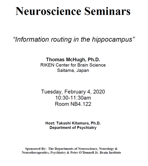 Come to our #neuroscience seminar hosted by Dr. Takashi Kitamura at 10:30am. Dr. Thomas McHugh @riken_en will present "Information routing in the hippocampus" pic.twitter.com/jGOHgHnhal