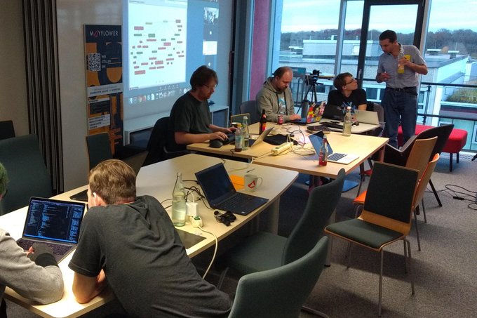 Snapshot from the #NixOS networkd hackathon at @mayflowergmbh Munich. Happily hacking and discussing. Thanks to @fpletz for setting this up! pic.twitter.com/9Ms4jWk8aG