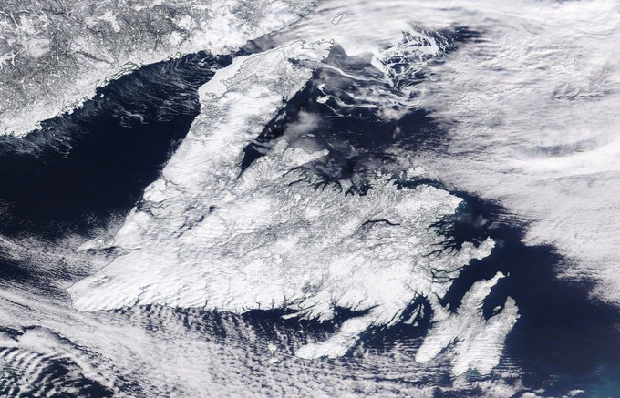 Beautiful snow covered island today. You can see the ice forming in the Strait of Belle Isle. #nlwx pic.twitter.com/VUsftwakuC