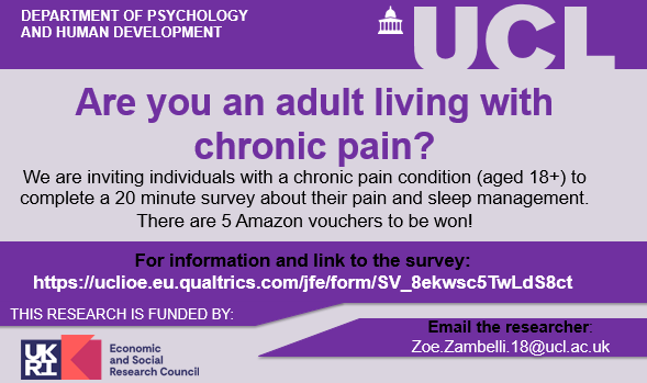 Looking for adults with #chronic #pain to take part in an online survey about pain and #sleep management. Visit uclioe.eu.qualtrics.com/jfe/form/SV_8e… for full info. 1st study for my PhD @ucl @LILAS_Lab funded by @ESRC. Please RT/share with colleagues and friends!#SCRIPstudyUCL pic.twitter.com/xAp7ZIgOCv