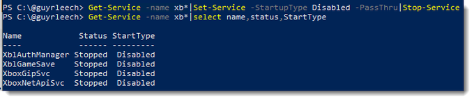 Get-Service -name xb*|Set-Service -StartupType Disabled -PassThru|Stop-Service pic.twitter.com/ILYMS4SQbC