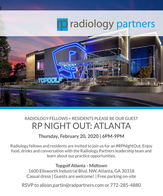 Hey #radres and #radfellows! Radiology Partners is coming to Atlanta on 2/20 for a fun night of food, drinks, and conversation at Topgolf! @EmoryRadiology pic.twitter.com/LNiQblPSw2
