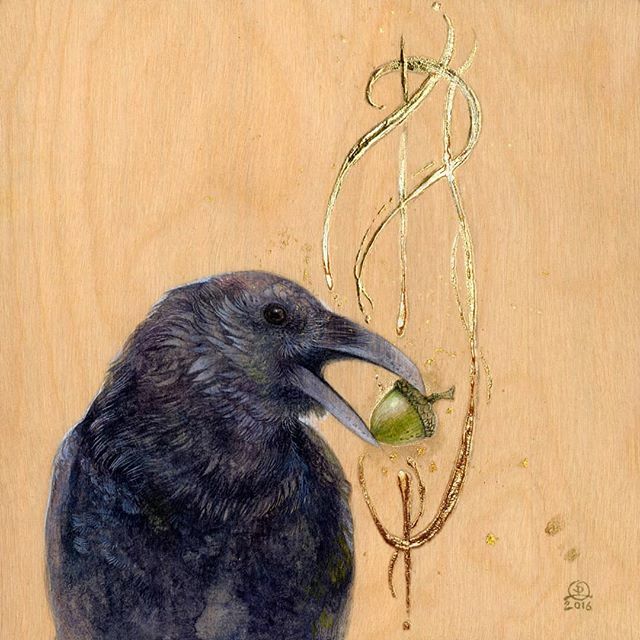 #Watercolor #painting #art #shadowscapes #gold #golden #goldleaf #shinystuff #acorn #blackbird #bird #raven #corvid #birdsinart