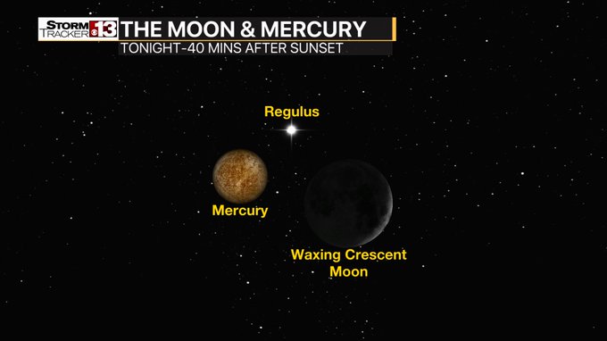 The #Moon & #Mercury doing the tango with the bright star #Regulus. Clear skies for viewing tonight. @WOWK13News pic.twitter.com/K9cXndlklY