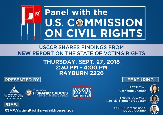 On Sept 27, Members of Congress are going hear directly from @USCCRgov on the state of voting rights in America. Their new report on minority access to voting was just released- the findings are alarming. It's up to us to protect voting rights for ALL Americans! #RestoreTheVOTE pic.twitter.com/6qAqNkOzHd