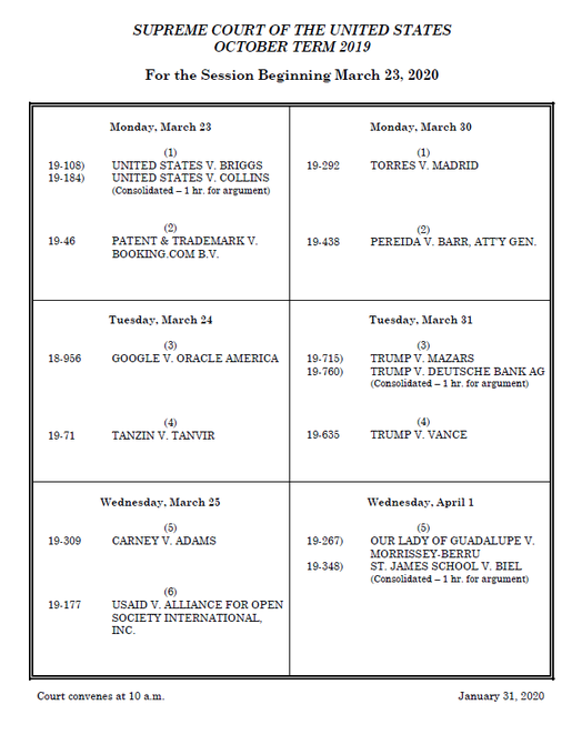 #SCOTUS releases its March oral argument calendar. The Justices will hear the dispute over subpoenas for President Trump's financial records on March 31. pic.twitter.com/sR3QA5kwNC