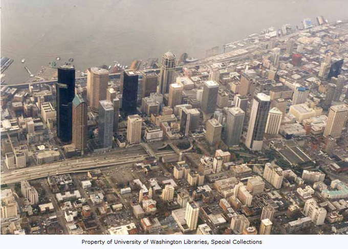 #SeattleSunday aerial view of downtown, Belltown, and First Hill neighborhoods! Can anyone guess what year this was photo was taken? 🏙️ pic.twitter.com/493Gku1znM