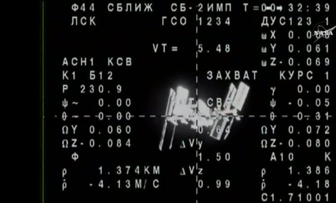 #Soyuz view of #ISS, now 1.34 km from Station, docking going smoothly #VITAmission pic.twitter.com/a7FZezSBNl