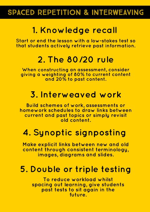 We are planning on focusing on these five ideas in school with our students to improve learning. Keep it simple. #interleaving #interweaving #spacedrepetition #scienceoflearning #ukedchat #edchat #edutwitter #SLTchat pic.twitter.com/kR2lA9b5Mc