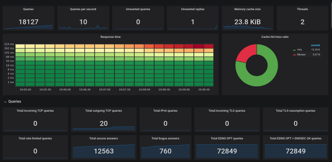 Created a nice one @grafana dashboard for my in-home #Unbound DNS resolver instance pic.twitter.com/pa4ffMD3Q1