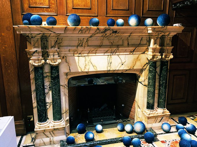 The new #Unbound exhibition at @TwoTemplePlace is well worth a visit. I loved the way Hiroyuki Shindo's indigo balls looked like they'd multiplied all over the marble hall like Tribbles. #WomenCollectingTextiles pic.twitter.com/Y8PCrZi9Lr