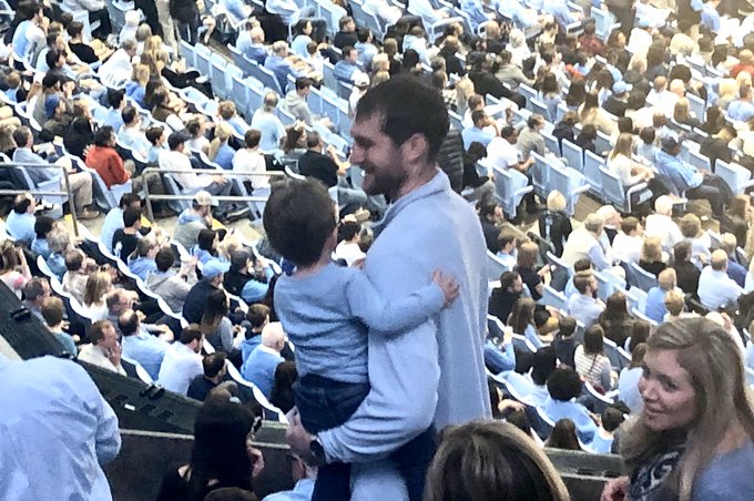 Former #UNC center Tyler Zeller (with child) here in the plush section of the upper deck. pic.twitter.com/nMezyeEnBE