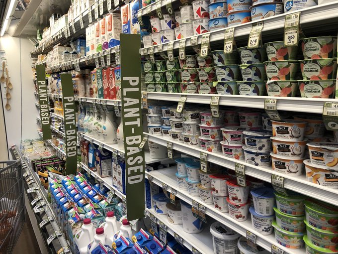 The #plant-based "fake milk" section is now even bigger than the real dairy. Too bad it's all sugars, plant oils, soy, carbs. The new "junk food?" #vegan pic.twitter.com/fjpvpC6SyV