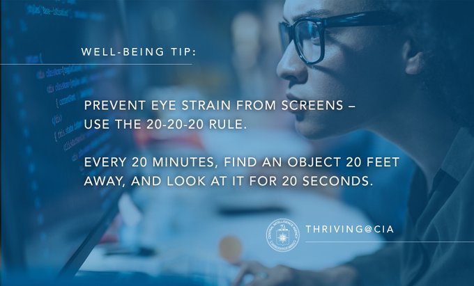 We encourage our officers to use the 20-20-20 rule. Every 20 minutes, find an object 20 feet away, and look at it for 20 seconds.