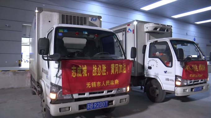 Two refrigerated trucks carrying medical supplies worth 16.8 million yuan ($2.4 million) from #Wuxi to Hubei province set off at 10 pm on Feb 2. After traveling 900 km overnight, they successfully delivered Wuxi’s #donations to Huanggang Central Hospital at 8:30 am on Feb 3. pic.twitter.com/b9ILF6pYA3