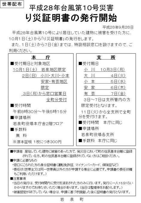 【お知らせ】り災証明発行開始のお知らせ(9/30) - town.iwaizumi.lg.jp/iwaizumi_blog/… pic.twitter.com/fv4WGFp1Uj