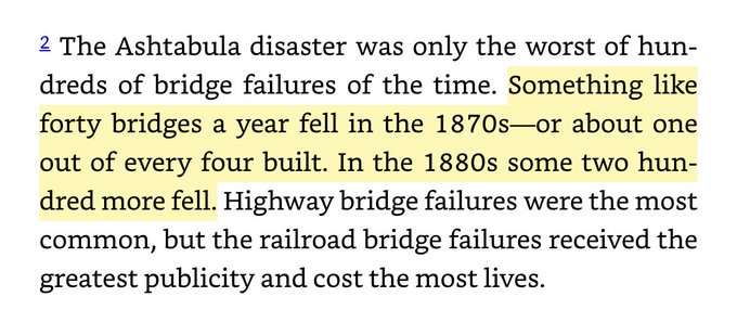 This footnote in McCullough's *The Great Bridge* blew my mind. As late as the 1880s, we still didn't know how to build bridges! We would put them up, and many would just collapse. pic.twitter.com/6vjfkQ482H