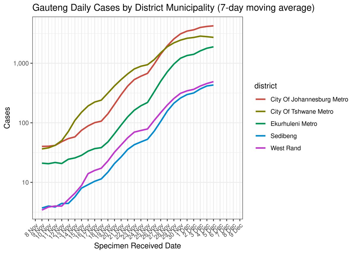 In Gauteng daily cases may be flattening out. Tshwane might have peaked. Cases are at 2,717 per day after peaking at 2,852 per day (7-day moving averages). Wave 3 peaked at 3,210 per day. pic.twitter.com/VGzfvmAdNI