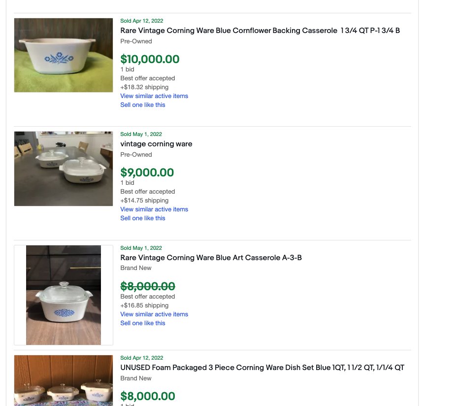 these are sold listings on ebay- what's going on here? is this like that wayfair child trafficking conspiracy theory because cheap cabinets were listed at 40K? (it was easily explained) bc there's no way corningwear is worth 10k.pic.twitter.com/H3z8KpcfPR