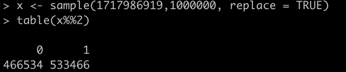 The “sample” function in the statistical programming language R is biased… See screenshot.