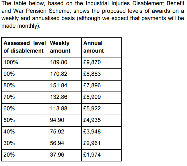 . @NIOgov consultation document sets out sliding scale of troubles payments depending on severity someone's disability. Payments will be backdated to Dec 2014 & 10 year lump sums are available to those aged 60 pic.twitter.com/yWUUnP0KuB