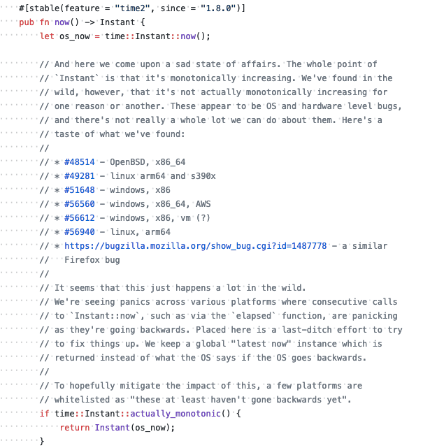 It has been 0 days since I showed coworkers the cursed Instant::now() code from Rust stdlib pic.twitter.com/V5Rdzw0kDi