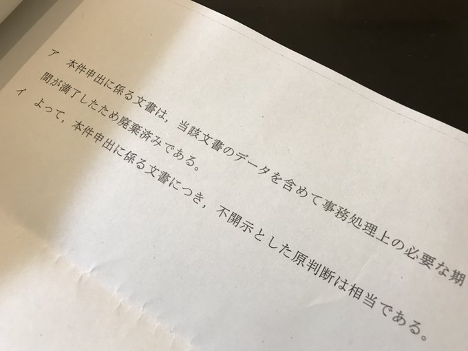 最高裁判所から封書。昨年1年間の「全国の裁判官・裁判所職員の不祥事の発表の有無がわかる文書」を開示請求したら「不存在」と言われたので、審査会に不服を申し立てていたところ、最高裁側の言い分が送られてきた。曰く、当該文書は「データを含めて廃棄済み」と。すごいぞ裁判所。1年未満で全廃棄。 pic.twitter.com/Ff9N4WwsVb
