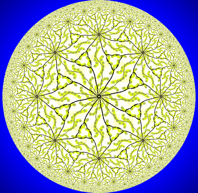I'm working on a hyperbolic doodler -- an online paint program for triangle group tessellations. Here are some test images. Wabi-sabi meets the hyperbolic plane meets webgl. pic.twitter.com/GIkaBPey5K