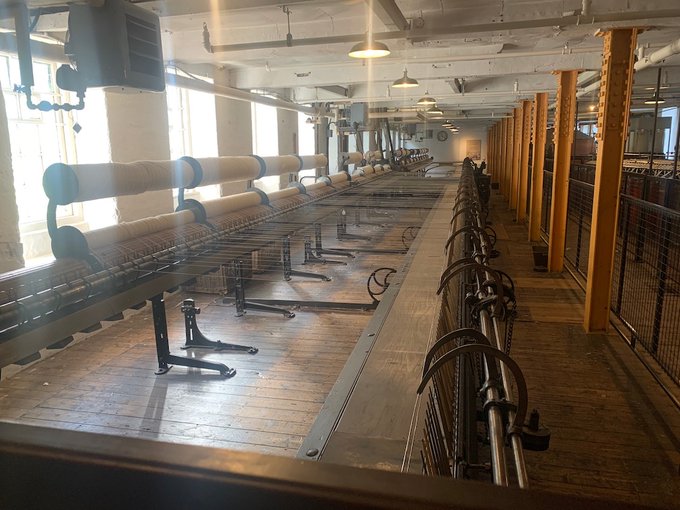 Spinning jenny with 100 spindles at Quarry Bank, a restored cotton mill in Manchester, England, originally built in 1784. This was first driven by a water wheel, later a steam engine. (Photo credit: Paul McLellan) pic.twitter.com/pBMkhIOtfj