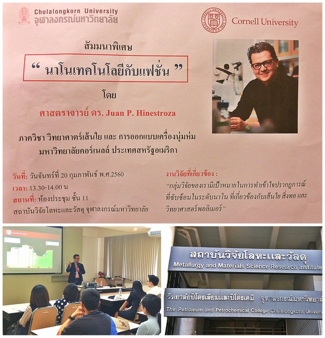 FSAD prof Juan Hinestroza is presenting at @ChulalongkornU during the Feb break. #cufashion #cornellfashion #iamhumec #wearabledevices pic.twitter.com/6o2pvSXMB3