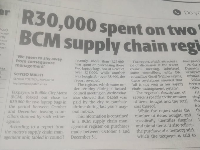 The Buffalo City Metro bought two laptop bags for R30 000 and a “memory stick” for more than R6 000. pic.twitter.com/uIHE5cM0Ru