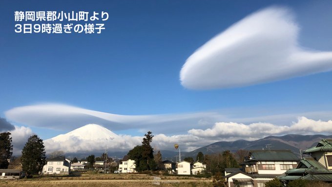今日3日(月)朝は関東・東海では青空が見えているところが多くなりました。そんな中、富士山の上空に笠雲が、さらに東に少し離れたところには「つるし雲」と呼ばれる不思議な雲が出現しました。